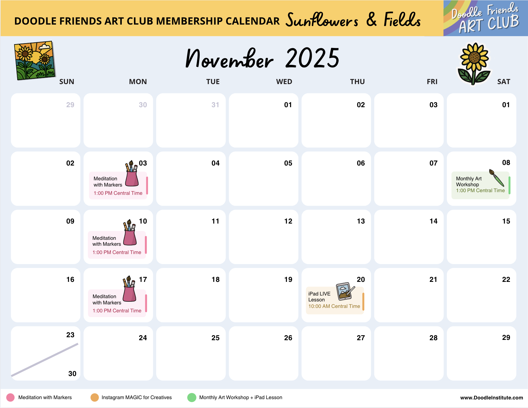 Gather with Diane and fellow doodlers for inspiring Zoom sessions. Just show up with your art supplies and follow along — it’s your time to explore, create, and recharge in real time.