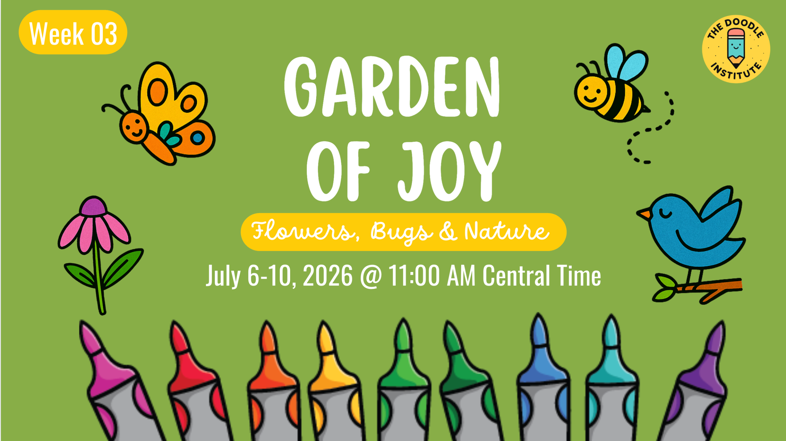In Week 3, families step into a world of bright flowers, buzzing bees, fluttering butterflies, and colorful garden creatures as everyone fills their sketchbooks with joyful, nature-inspired doodles. This week is perfect for anyone who loves color, nature, and gentle, imaginative drawing sessions. Each day, we explore a new part of the garden together—learning simple steps to draw flowers, insects, animals, leaves, and beautiful nature patterns.