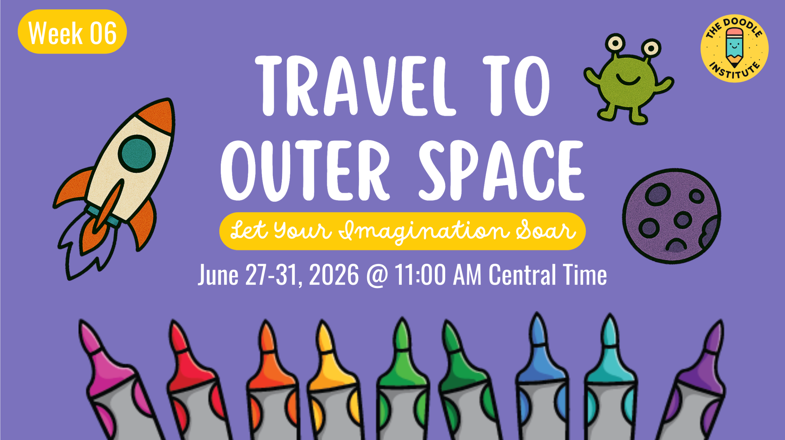 In Week 6 of Doodle Camp, we head into outer space for a week filled with rockets, stars, planets, galaxies, silly aliens, and imagination beyond the clouds.